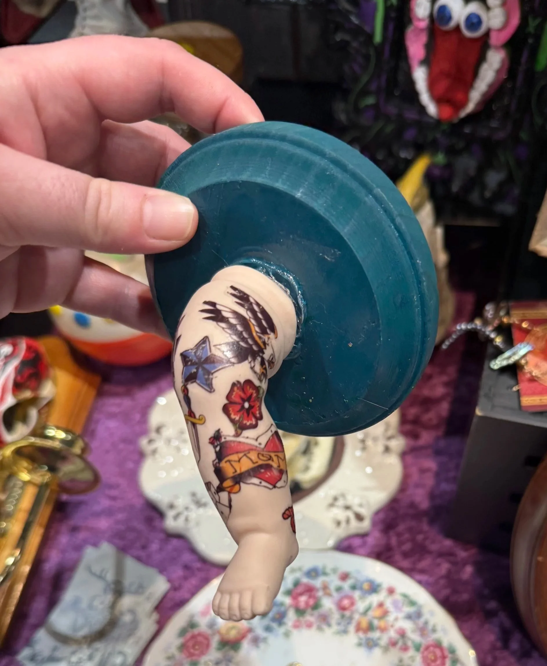 But the booth that completely stole my heart featured little baroque ceramic figurines with their heads swapped for plastic dinosaur heads. They were hilarious and wonderful. I wanted them all. The same booth also had a framed doll’s leg with American traditional tattoos painted on it, and I was very tempted to buy it. Then I remembered my daughter has dolls she’ll grow out of, and I could always experiment with those later.